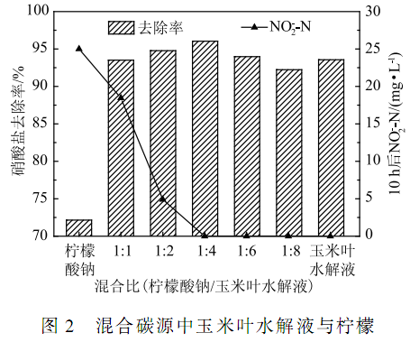 玉米葉水解液與傳統(tǒng)碳源混合可能會提高硝酸鹽去除率,使處理后水質(zhì)達到更高標準。 將玉米葉水解液與檸檬酸鈉溶液以不同的比例混合,檸檬酸鈉加入量基于 C / N 為 9,初始 NO -3 -N 為 100 mg·L - 1時,考察混合比對好氧反硝化性能的影響。