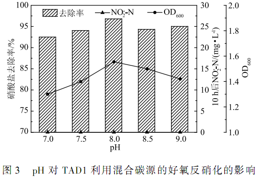 用,從而充分還原硝酸鹽。 另外,檸檬酸鈉能使周質(zhì)硝酸鹽還原酶活性增強,使好氧反硝化進行得更徹底。 以混合液為碳源時,最適宜 pH 為 8. 0。 這時由于 TAD1 利用含玉米葉水解液的混合碳源生長時,在胞外酶的作用下進一步將糖類分解為有機酸,使 pH 降低,偏堿性有利于補償碳源分解帶來的 pH 下降。但是,在 pH 為 7. 0 ~ 9. 0 時,去除率均高于 92. 5% ,說明 TAD1 能適應(yīng)廢水處理過程中的 pH 的波動,具有實際意義。