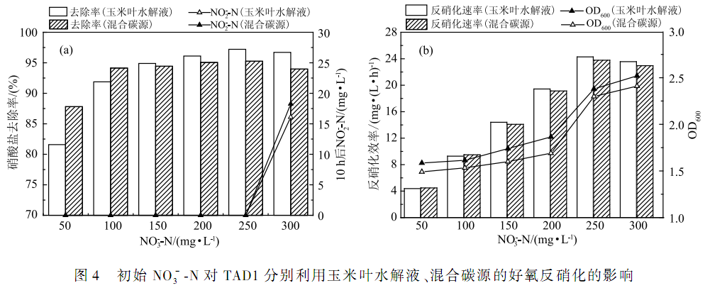 保持玉米葉水解液濃度不變,而檸檬酸鈉按 C / N 為 9 調(diào)整,使初始 NO -3 -N 濃度為 50、100、150、200、250、300 mg·L - 1,在最佳 pH 條件下考察不同初始 NO -3 -N 對 TAD1 以混合液為碳源時和以玉米葉水解液為唯一碳源時好氧反硝化性能的影響。