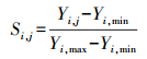 在將多響應變量轉(zhuǎn)化為單目標函數(shù)的過程中, 由于響應值單位或數(shù)量級間的差異, 應首先對響應面優(yōu)化過程中的各響應變量進行歸一化.如果假定實驗過程中有n個變量, 需要進行m組實驗, 則第i個變量第j組實驗得到的響應值(Yi, j)歸一化后的標準值(Si, j)為: