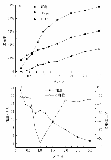 圖 1 Al/P比對污泥水磷、有機物和濁度去除的影響