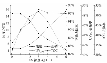 由于對混凝劑的競爭作用, 懸浮物濃度的變化會影響除磷效果.不同SS濃度下污泥水正磷、UV254、TOC和濁度的變化如圖 3所示.SS濃度小于1 g·L-1時對除磷效果影響較小, 此后隨SS濃度增大, 正磷去除率呈現(xiàn)下降趨勢.隨SS濃度的增加, TOC和UV254去除率均呈先增大后減小的趨勢, 最佳SS濃度為3 g·L-1.SS濃度小于1 g·L-1時對濁度影響不大, 此后濁度隨SS濃度增大則呈上升趨勢.