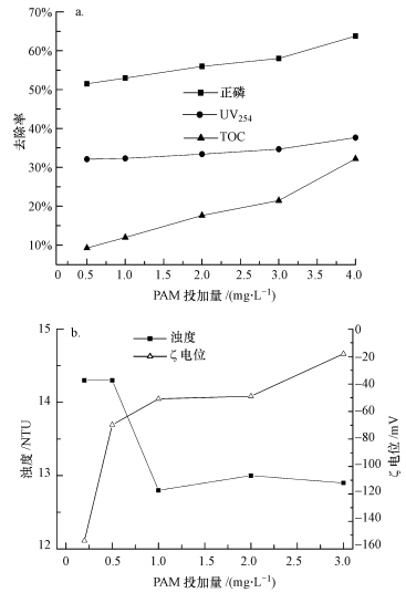 PAC能有效除磷但難以改善顆粒物的沉降特性, 投加PAM則能通過橋聯(lián)吸附使絮體結(jié)構(gòu)更為密實, 易于沉降. PAM投加量對污泥水正磷和有機物去除率的影響見圖 2a.隨PAM濃度增大, 正磷去除率增大, 但PAM濃度從0.5 mg·L-1升至3.0 mg·L-1時, 正磷去除率僅增大了12.3%, 表明PAM對于除磷效果影響很小.隨PAM濃度增加, TOC和UV254去除率均上升, 但上升幅度較小, 表明PAM對于有機物去除影響較小.由圖 2b可知, 低PAM濃度時, ζ電位距離等電點較遠, 膠體不易沉降; 隨PAM投加量的增加, ζ電位逐漸趨近于零, 顆粒物易于沉降, 出水濁度降低.這說明投加PAM有利于絮體聚集長大, 改善顆粒物沉降性能.