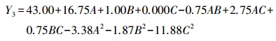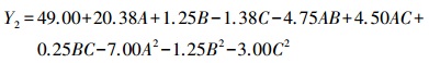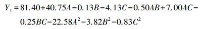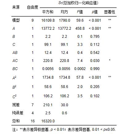模型的方差分析結(jié)果見表 1.所擬合的全變量二次回歸方程可決系數(shù)R2為0.9871, 表明預測值與實測值間有良好的擬合關(guān)系.模型CV值為8.48, 信噪比為23.28, 表明該實驗可信度和穩(wěn)定性良好.由表 1可知, 本實驗所選模型不同處理間差異顯著(模型p < 0.01), 說明該實驗方法具有可靠性.