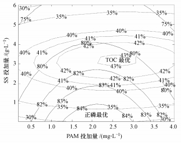 圖 4 PAM投加量和SS濃度對正磷和TOC去除率影響的等高線圖