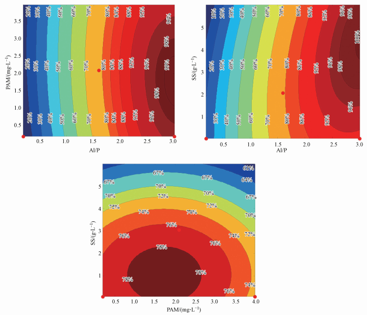 根據(jù)Box-Behnken模型分析結(jié)果, 優(yōu)化操作參數(shù)為:Al/P比3.00、PAM投加量1.22 mg·L-1、SS濃度3.58 g·L-1, 該條件下Y1、Y2和Y3分別為99.6%、64.2%和55.9%.在該條件下進行驗證實驗, Y1、Y2和Y3分別為93.1%、60.4%和53.9%, 相對偏差分別為6.5%、5.8%和3.6%, 說明模型可信度較高.